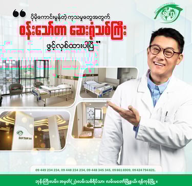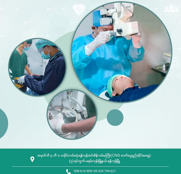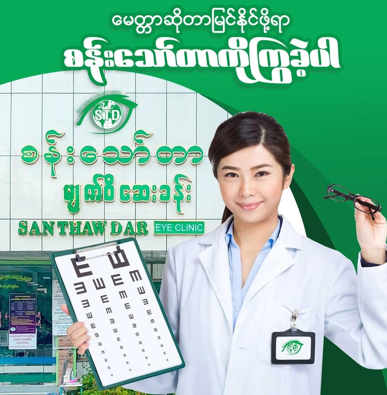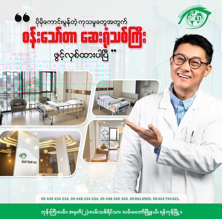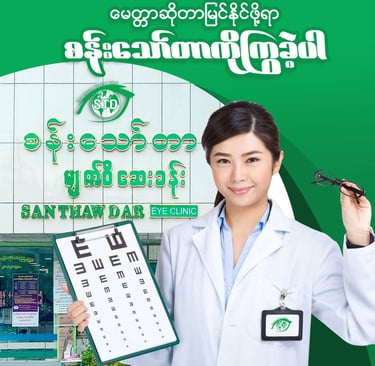 San Thaw Dar Eye Hospital offers complete vision care, including eye checkups, cataract surgery, glaucoma management, diabetic eye screening, and pediatric eye care. Our optical shop provides a wide range of eyewear and lenses, ensuring clear and comfortable vision for every patient.